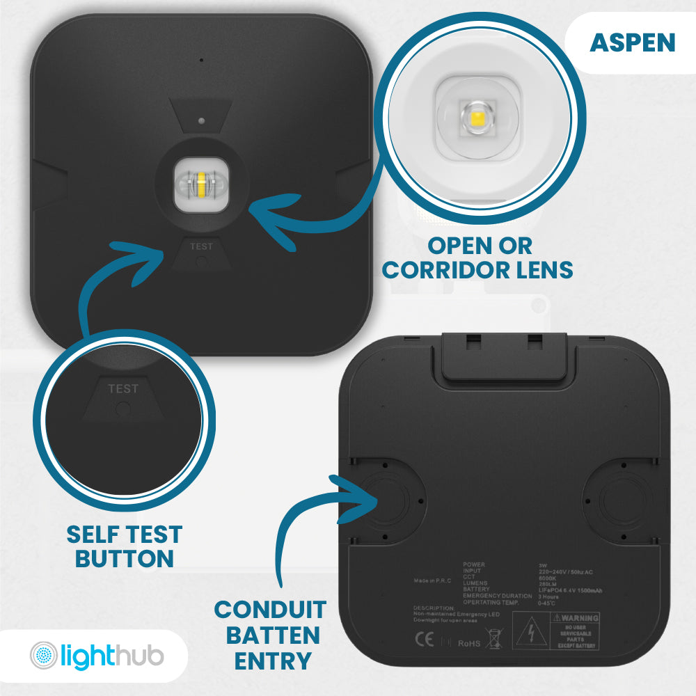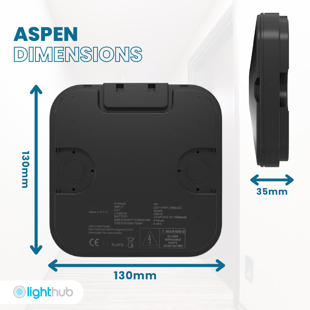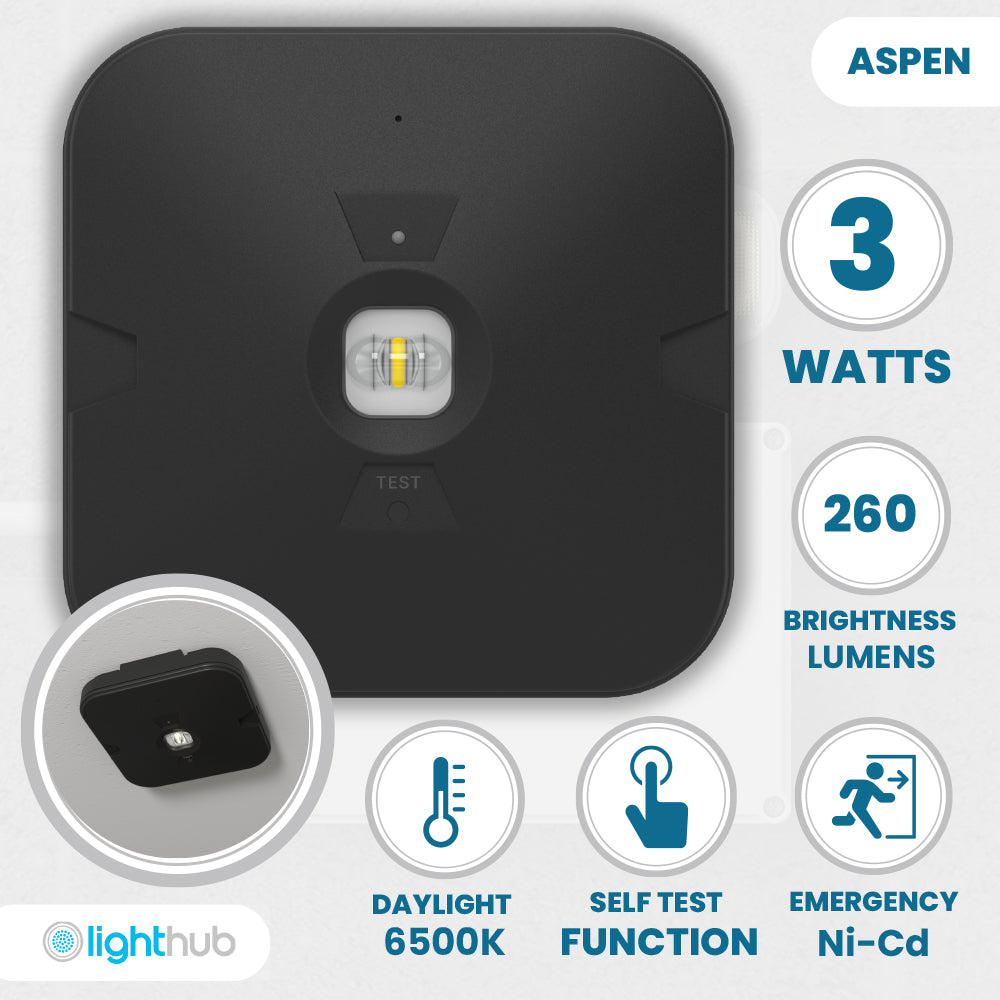 ASPEN Surface LED Downlight Ceiling Spot Light | LED 3W 280lm | 6000K Daylight | IP44 Black | 3hr Emergency | Corridor Lens