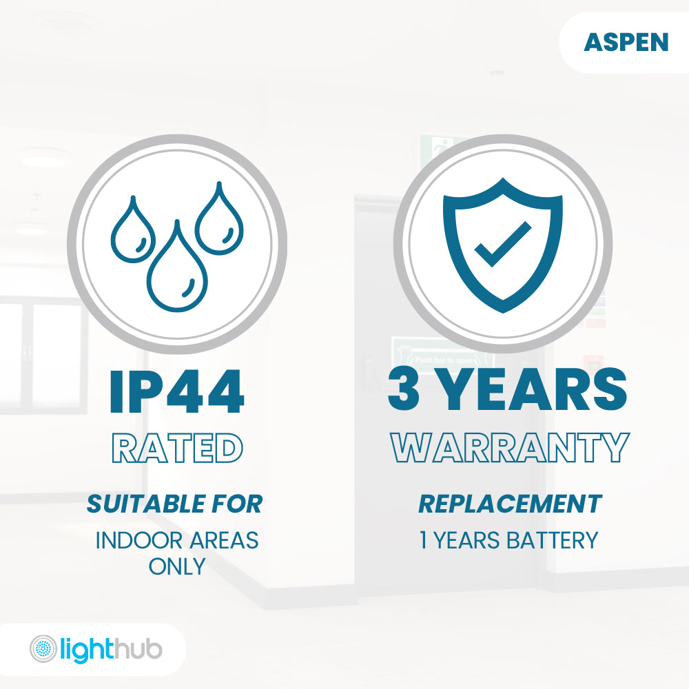This corridor lens surface emergency downlight can be mounted at heights of 10M and will operate at 280 lumens on the battery for 3 hours, providing illumination for the safe evacuation of a building. Suitable for narrow areas such as corridors, walkways, escape routes and other narrow applications.