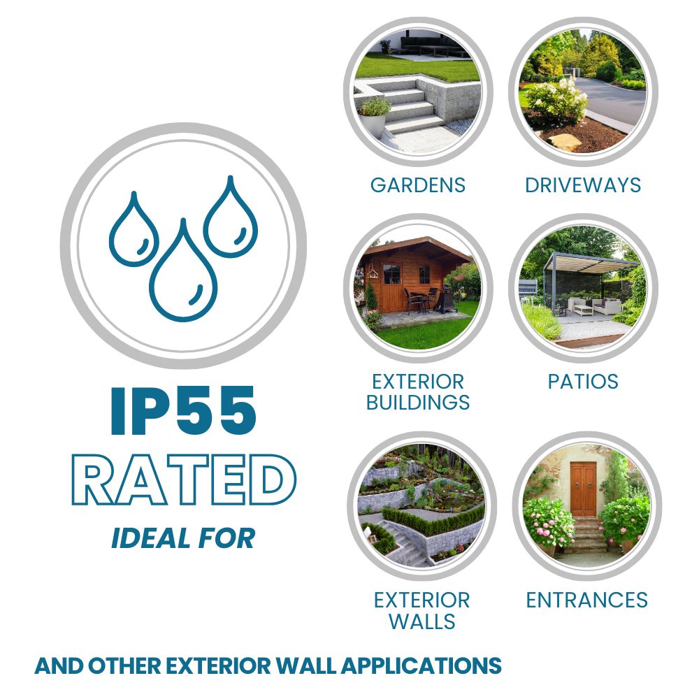 The curved design and black finish give it a contemporary look, while the IP55 rating ensures protection against rain and dust. Energy-efficient and low-maintenance, this wall light is perfect for creating a welcoming yet practical lighting solution for any outdoor setting.