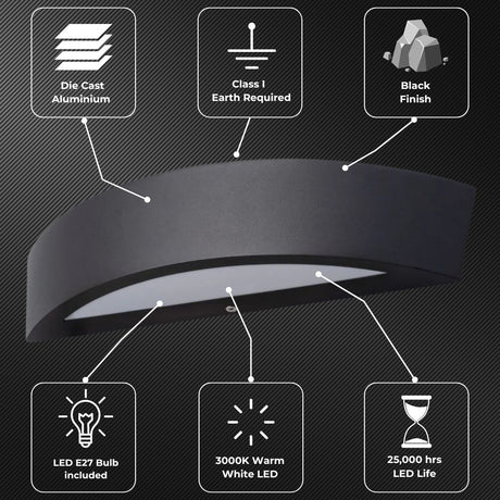 POOLE | Outdoor Curved Up Down Wall Light Fitting | 12.5W LED | 4000K Neutral White | IP65 | Black