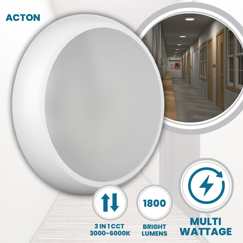 The ACTON Tri-Colour & Multi Wattage LED bulkhead is an ultimate all in one surface light fitting. Ideal for communal hallways, stairs, corridors, bathrooms, HMO or other indoor spaces, whether ceiling or wall mounted.