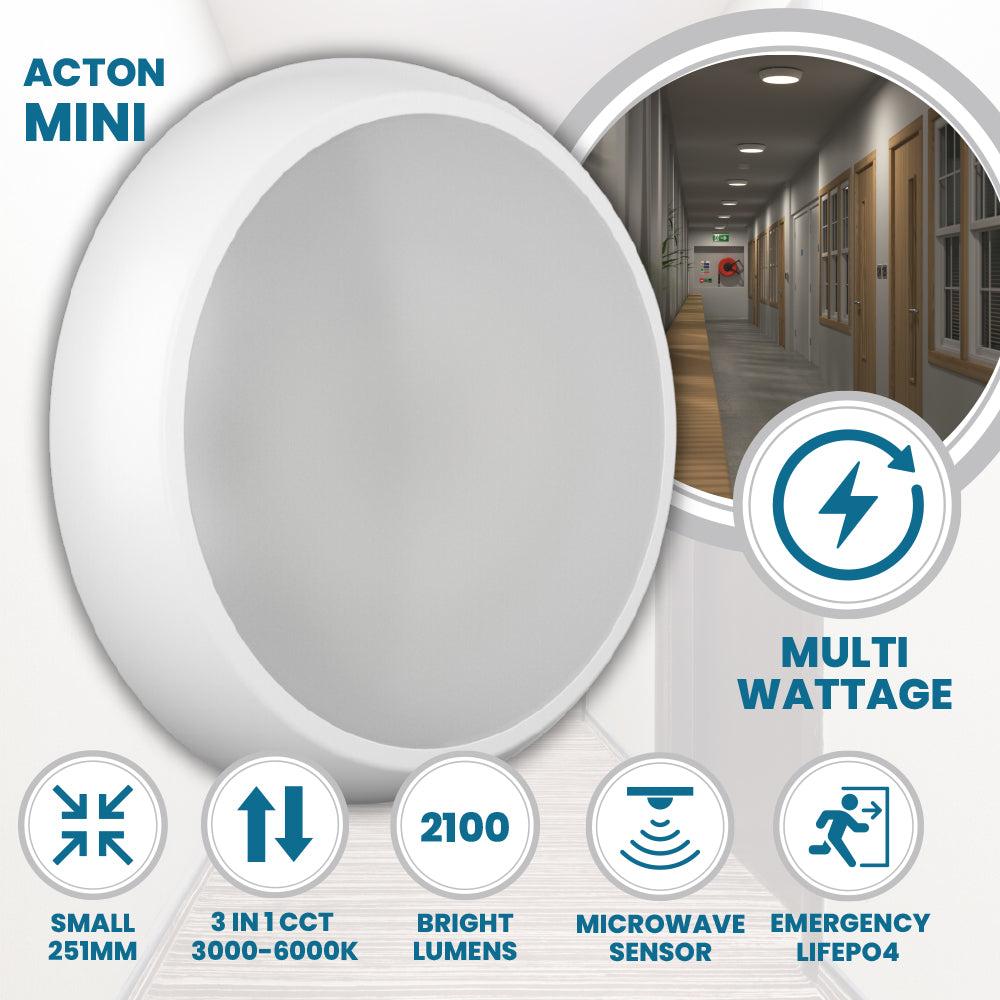 The ACTON MINI Small Microwave Motion Sensor & Emergency Tri-Colour & Multi Wattage LED bulkhead is an ultimate all in one surface light fitting. Ideal for communal hallways, stairs, corridors, bathrooms, HMO or other indoor spaces, whether ceiling or wall mounted.