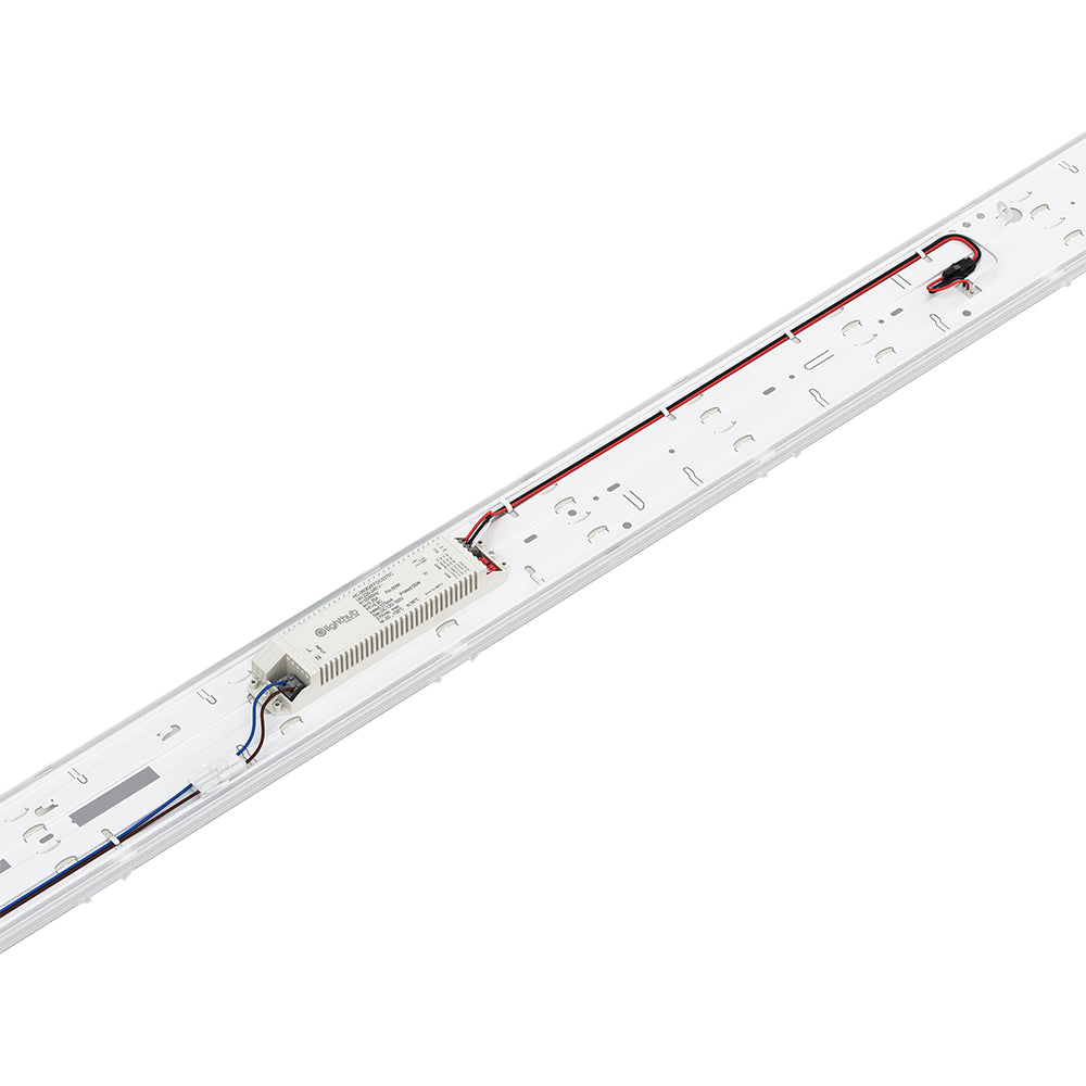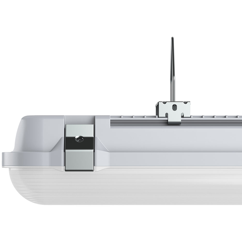 Highly efficient 120 lumens per watt light output via integrated LEDs. Heavy-duty stainless-steel clips to secure the diffuser in place and fix the light to the ceiling surface. Stainless steel will not rust or corrode. Features single gland knockout at the end of the fitting.