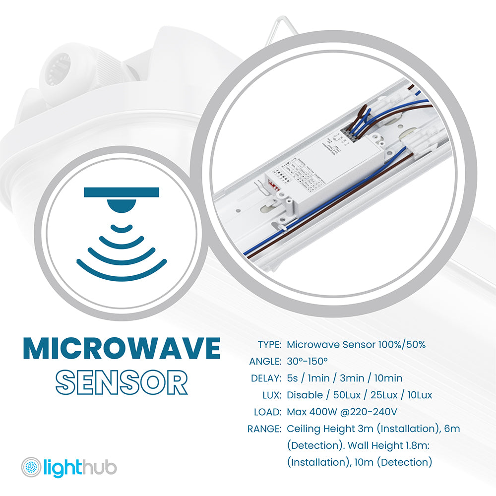 BATTERSEA Non-Corrosive LED Batten Light | 6ft Single 4800lm | CCT Tri-Colour & Multi Wattage | IP66 | Microwave Sensor