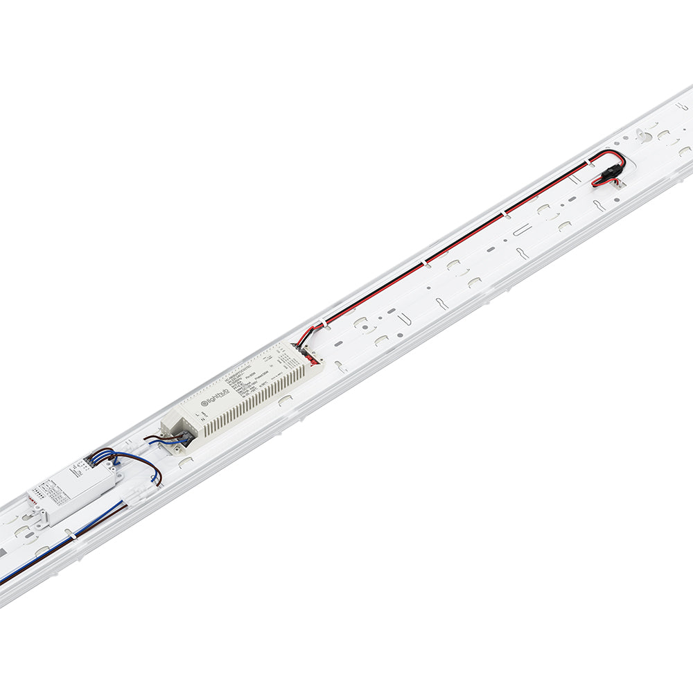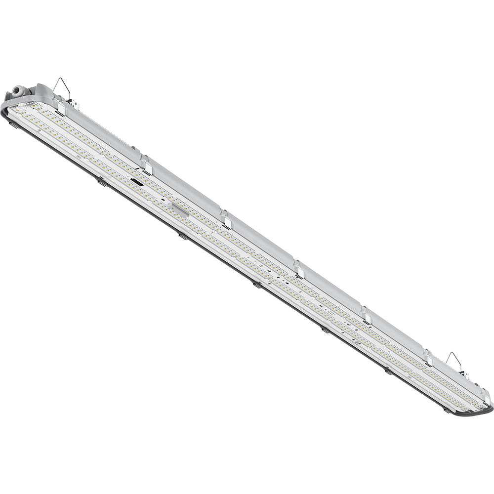 Highly efficient 120 lumens per watt light output via integrated LEDs. Heavy-duty stainless-steel clips to secure the diffuser in place and fix the light to the ceiling surface. Stainless steel will not rust or corrode. Features single gland knockout at the end of the fitting.