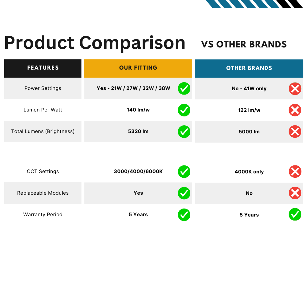 • Multi-Wattage & CCT – 21W-38W, 3000K-6000K.