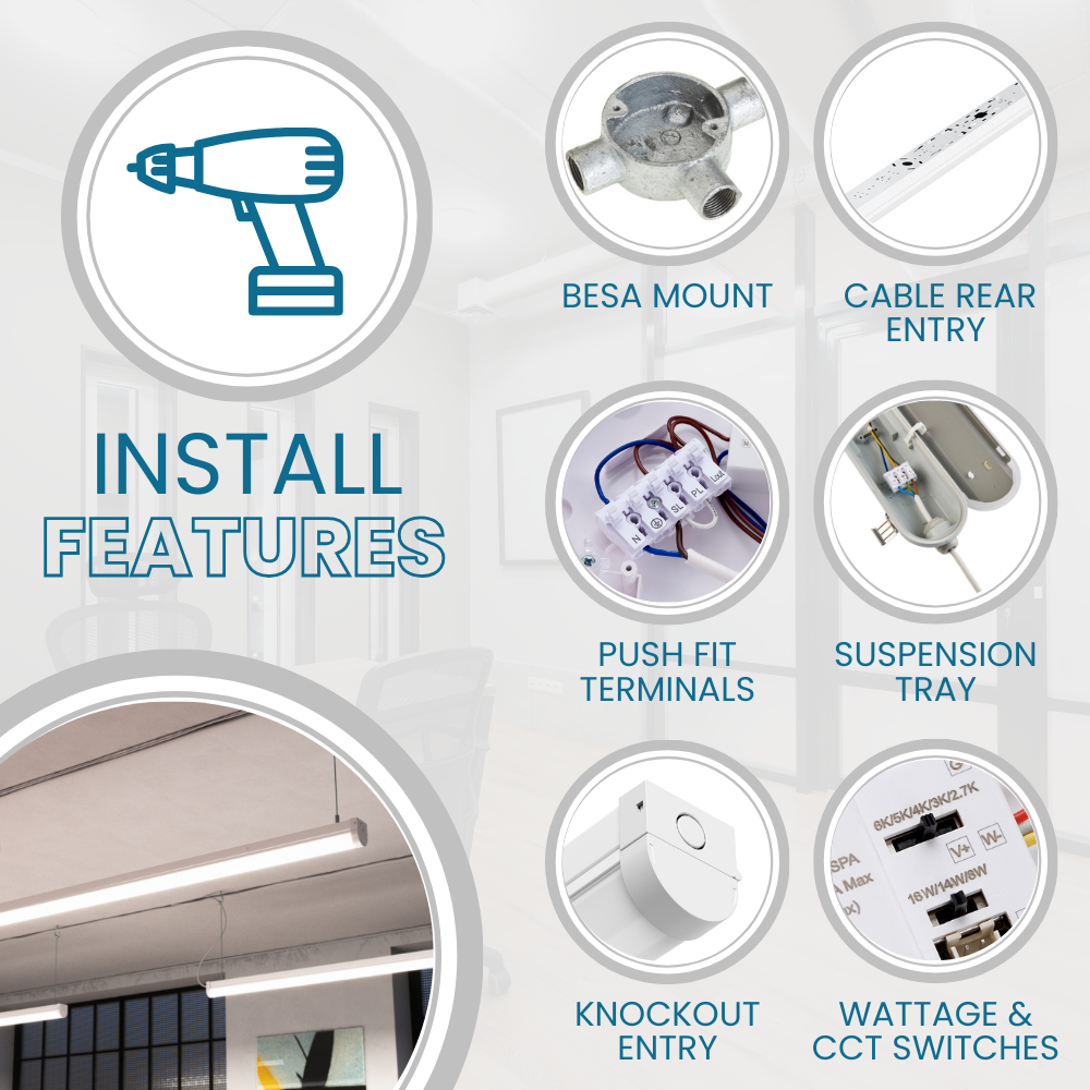 The switchable CCT (3000K, 4000K, 6000K) provides flexible lighting, while the screwless fast-fix hinged diffuser ensures effortless installation and maintenance. With a sleek, durable design and IP20 rating, this batten is an ideal upgrade from traditional fluorescent fittings.