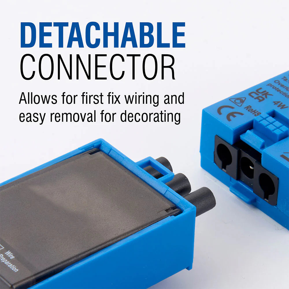 The 4 CCT Fire‑Rated Tilt Downlight delivers outstanding flexibility and performance in a compact, matt‑white housing. With switch‑selectable 3‑way wattage (4 W, 6 W, 8 W) and 4‑way CCT (2700 K, 3000 K, 4000 K, 6000 K), it's perfect for ambient or task lighting. Designed for tough environments, it's IP44 rated and tested for 30/60/90‑minute fire-rated ceilings. The adjustable tilt design offers targeted beam control, while easy to install with push-fit terminals and insulation compatibility. It includes a dimmable driver and is supported by a 5‑year warranty.