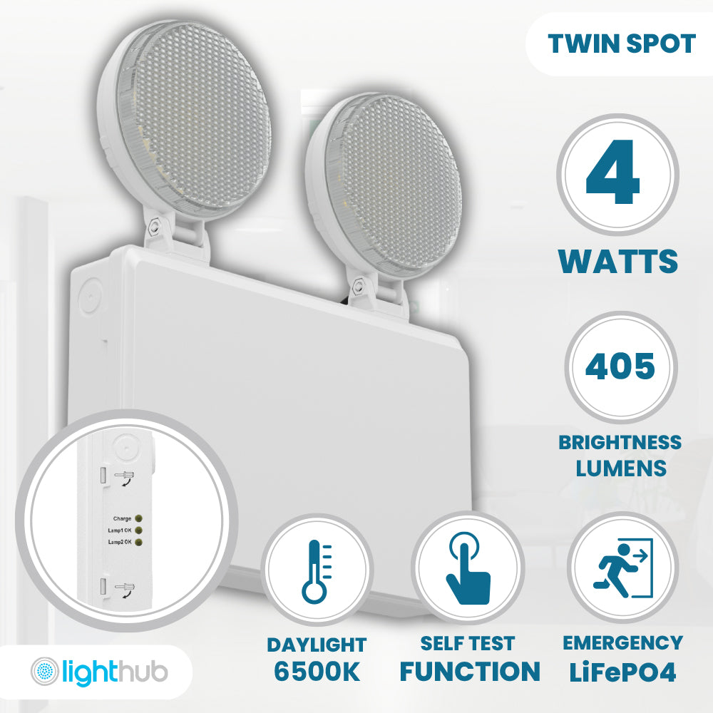 TWIN SPOT Self-Test Wall Light | LED 4W 405LM | 6500K Daylight | IP20 | Non-Maintained | 3hr Emergency Function