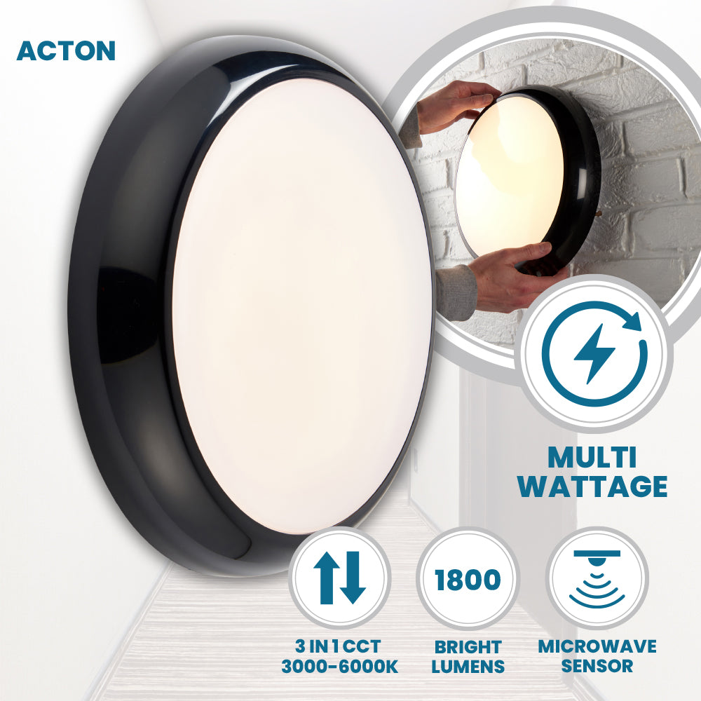 ACTON CCT Slim Bulkhead Light Fitting | LED Multi Wattage 1800lm | CCT Tri-Colour Switchable | IP65 | Black | Microwave Motion Sensor