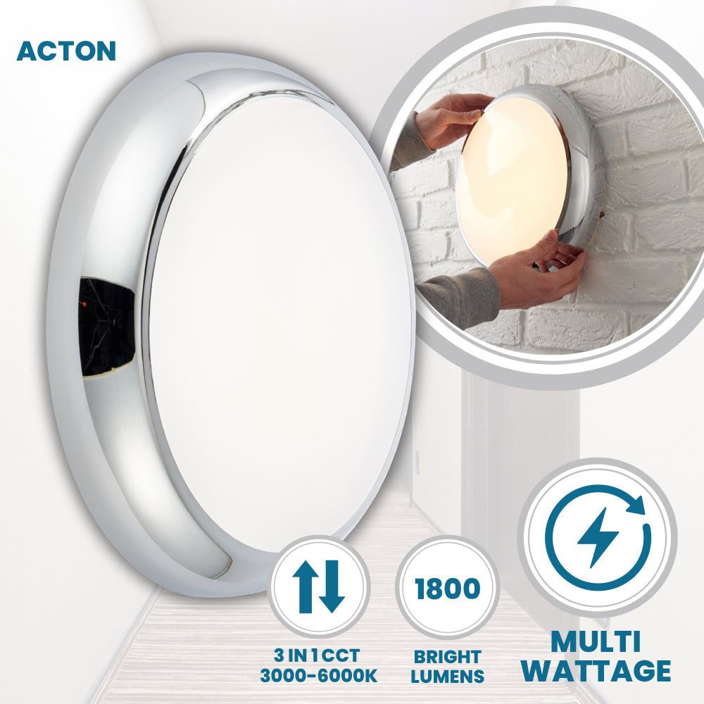 ACTON CCT Slim Bulkhead Light Fitting | LED Multi Wattage 1800lm | CCT Tri-Colour Switchable | IP65 | Chrome | Standard