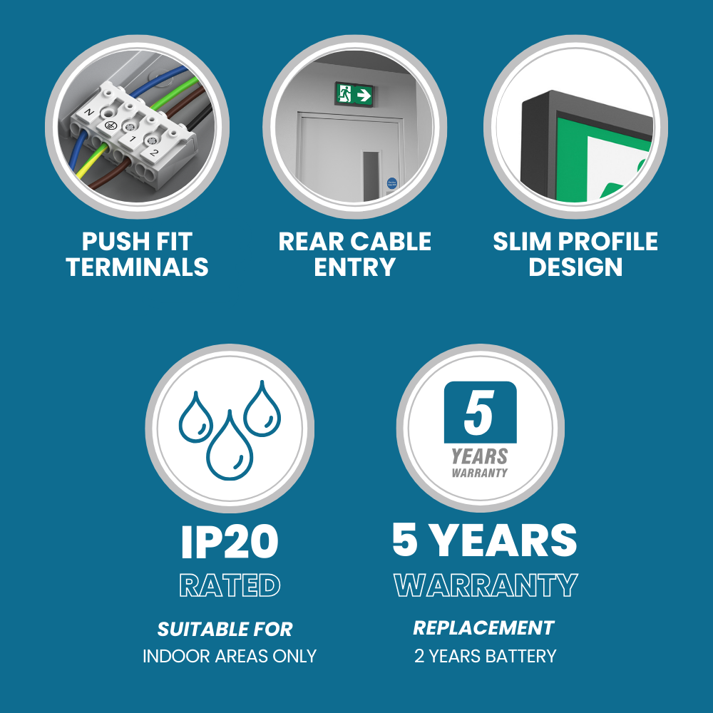 Supplied with interchangeable directional legends (up, down, left, right), it ensures clear guidance in all escape route scenarios. Powered by energy-efficient LEDs, this fitting is reliable, easy to install, and fully compliant with UK emergency lighting standards.