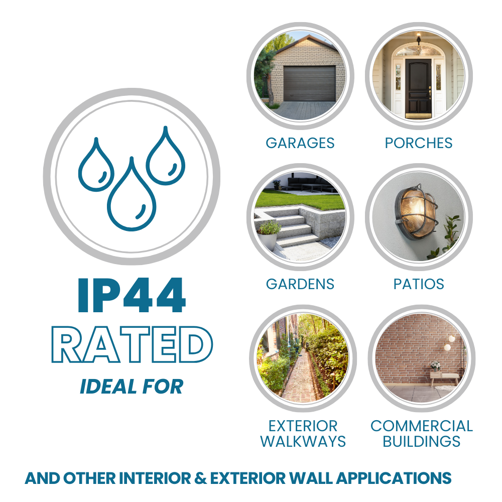 IP44 - Splash-resistant, suitable for indoor and outdoor use.