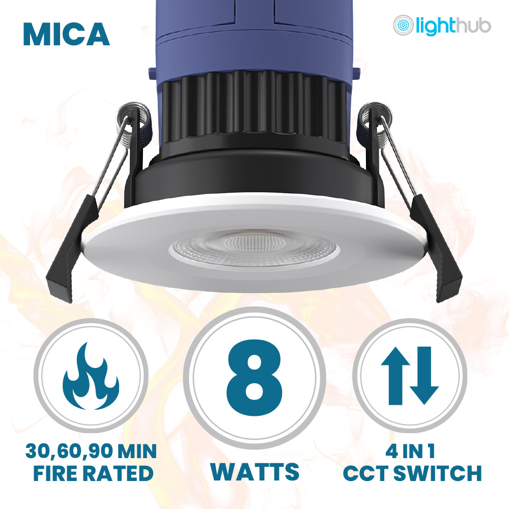 MICA | Quad-Colour CCT | LED Fire Rated Downlight | Dimmable 8W 900lm | IP65 | White | Emergency