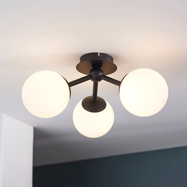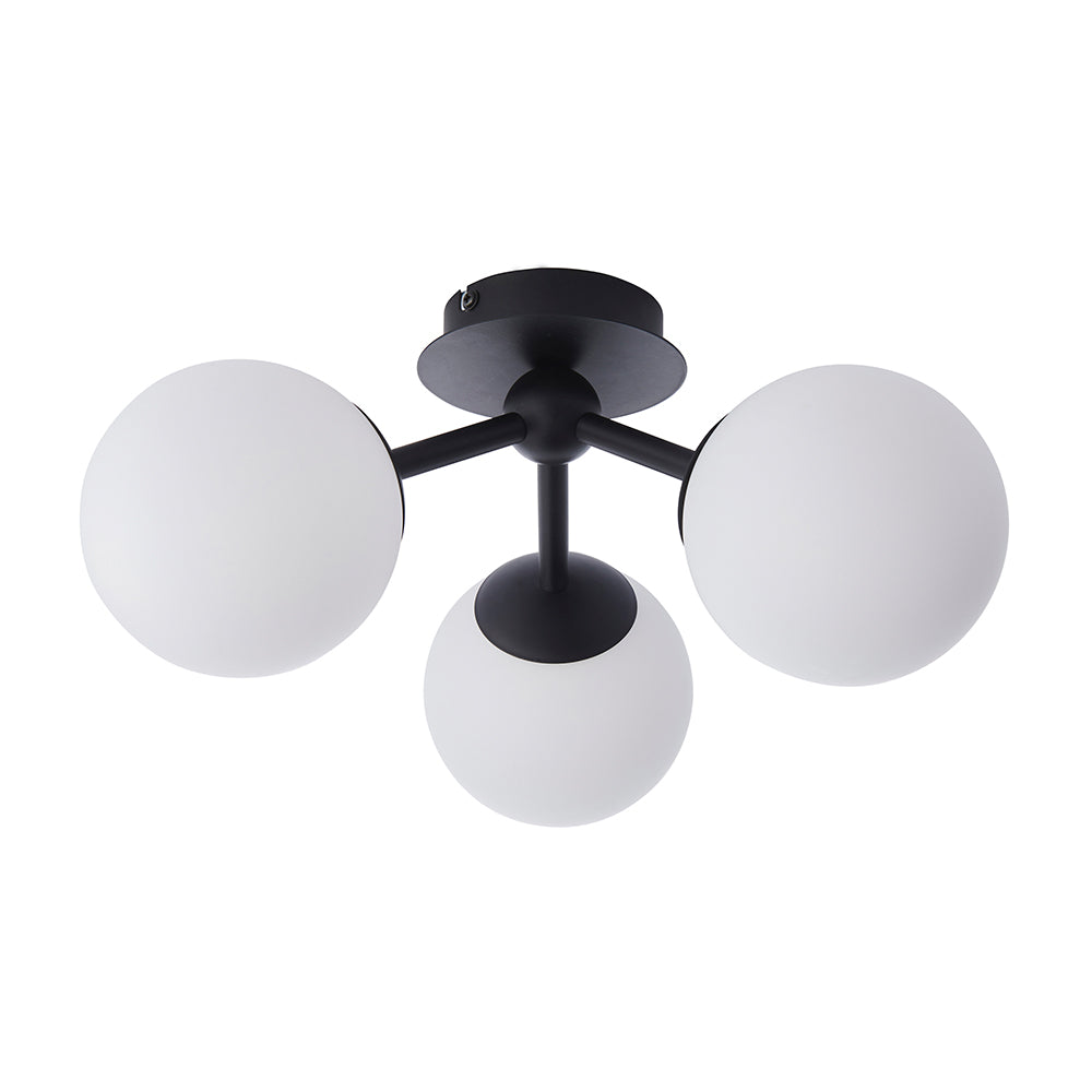 The Pulsa 3-Light Semi Flush is a stylish ceiling fixture that combines modern design with practical functionality. Featuring sleek matt black painted metalwork and elegant matt white glass shades, this light adds a contemporary touch to any interior space. Its semi-flush design is ideal for rooms with lower ceilings, providing ample illumination without occupying excessive space.
