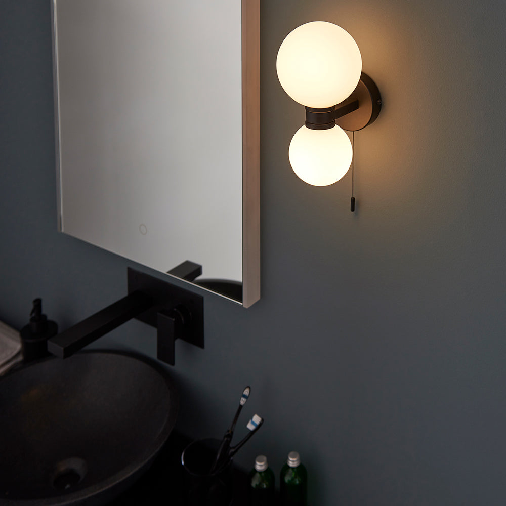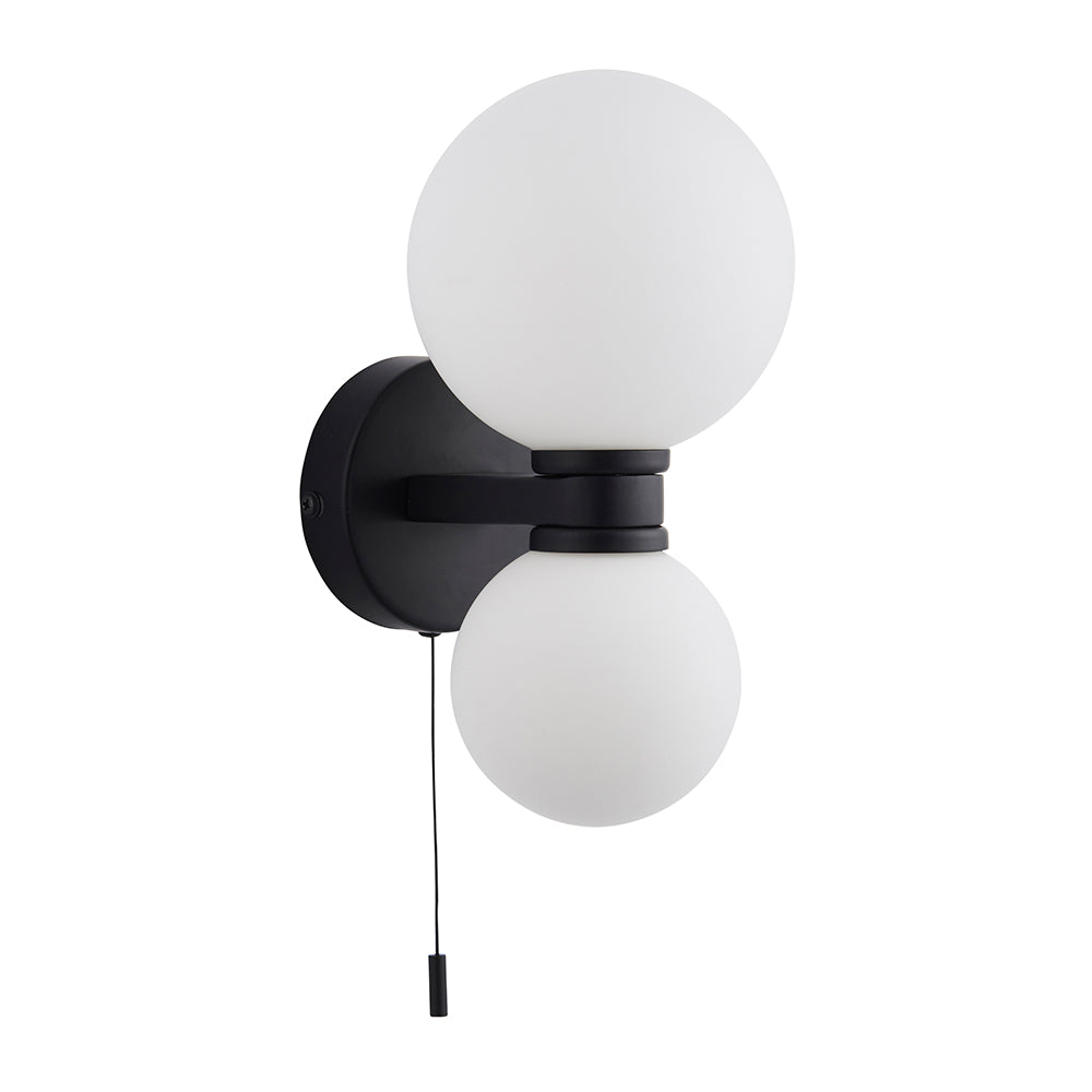 PULSA | Globe Glass Waterproof Dimmable Wall 2-Light Semi-Flush Fitting with Pullcord | G9 | IP44 | Matt Black