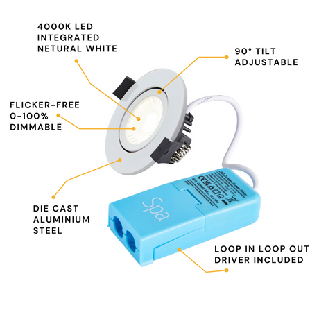 SPEY | Quad-Colour CCT | LED Tilt Adjustable Fire Rated Downlight | Dimmable 5W 580lm | IP65 | White