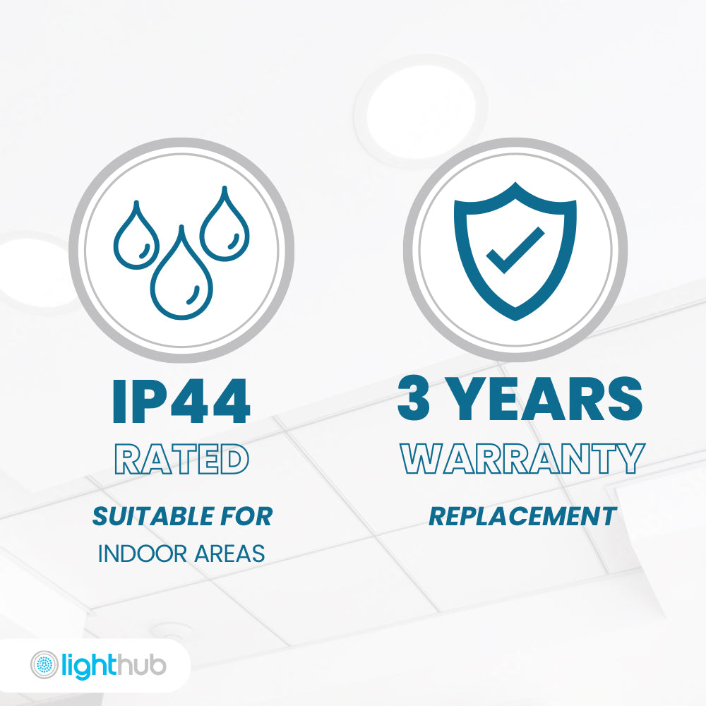The LightHub slim round panel LED downlight comes as a Standard or Emergency fitting. The round panel downlight is suitable for all semi commercial and domestic installations such as offices, shops, bathrooms, corridors, retail areas and more. The round panel downlight comes complete with a CCT Tri-Colour switch on the back of the unit, allowing you to choose between 3000K, 4000K and 6500K. Perfect for both installers and end users who may change their minds.