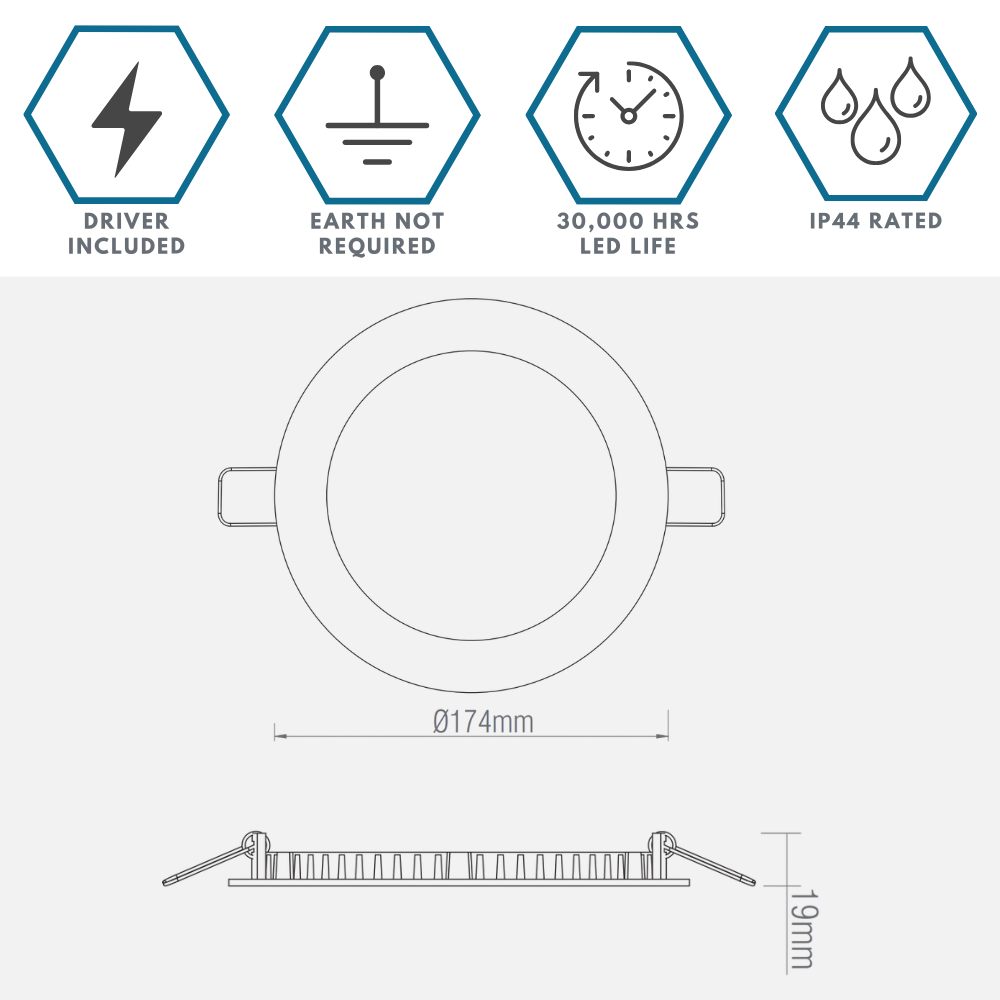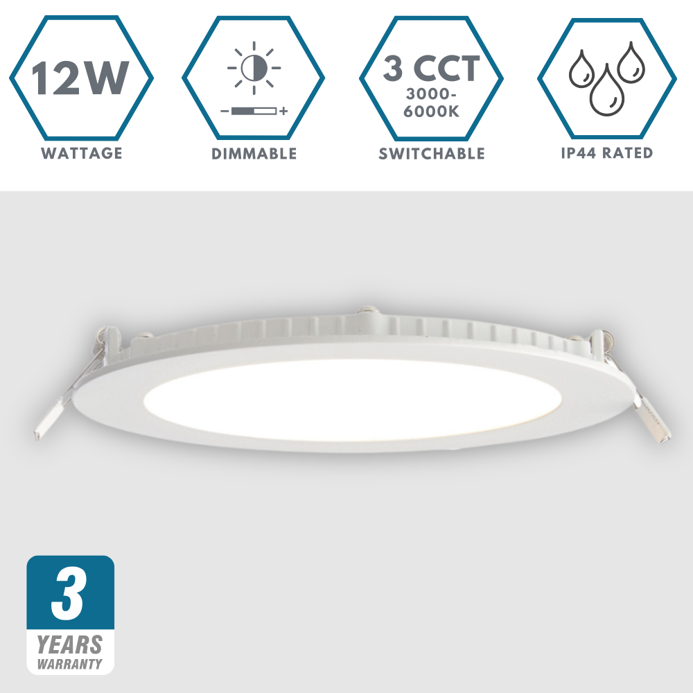 Dimmable Slim Flat Recessed Round Downlight Panel Light Fitting | LED 12W 1000lm | CCT Tri-Colour | IP44 | White