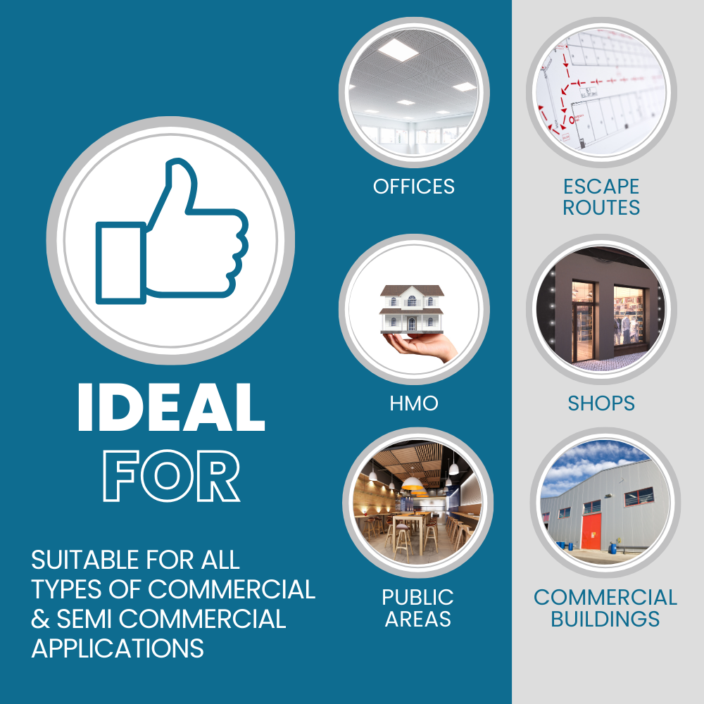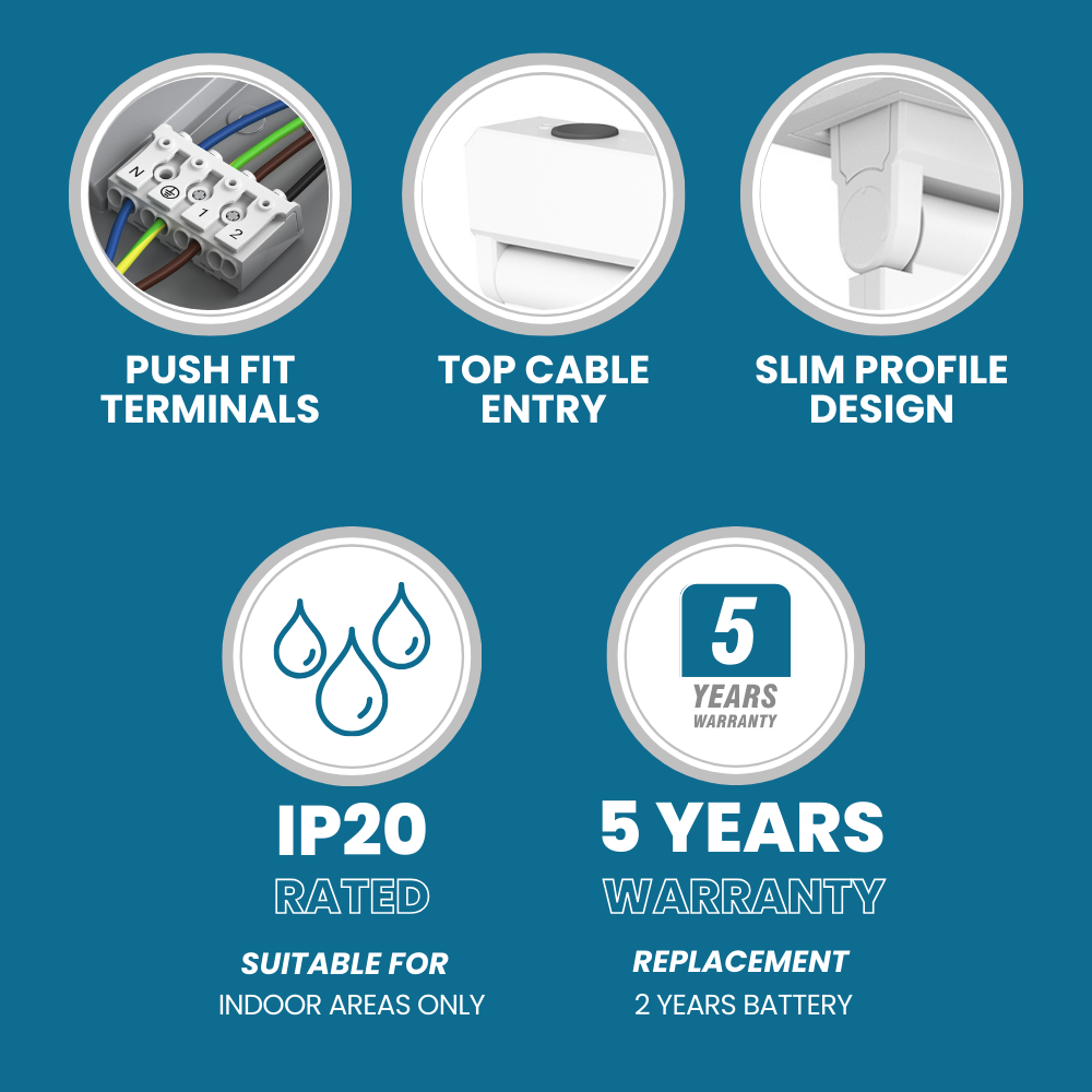 The fitting includes multi-position mounting options (wall, ceiling, or flag), making installation easy in any setting. Supplied with multiple directional legends (up, down, left, right), it ensures clear and compliant escape route signage. Finished in clean white with energy-efficient LED technology, it’s ideal for offices, schools, shops, and communal areas.