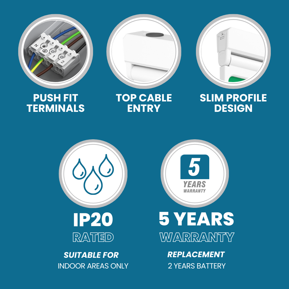 The fitting includes multi-position mounting options (wall, ceiling, or flag), making installation easy in any setting. Supplied with multiple directional legends (up, down, left, right), it ensures clear and compliant escape route signage. Finished in clean white with energy-efficient LED technology, it’s ideal for offices, schools, shops, and communal areas.