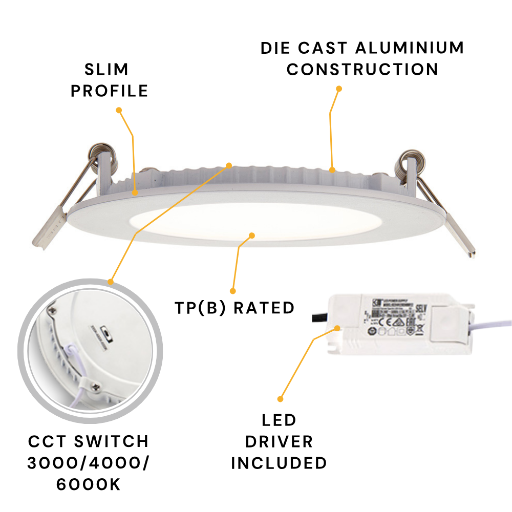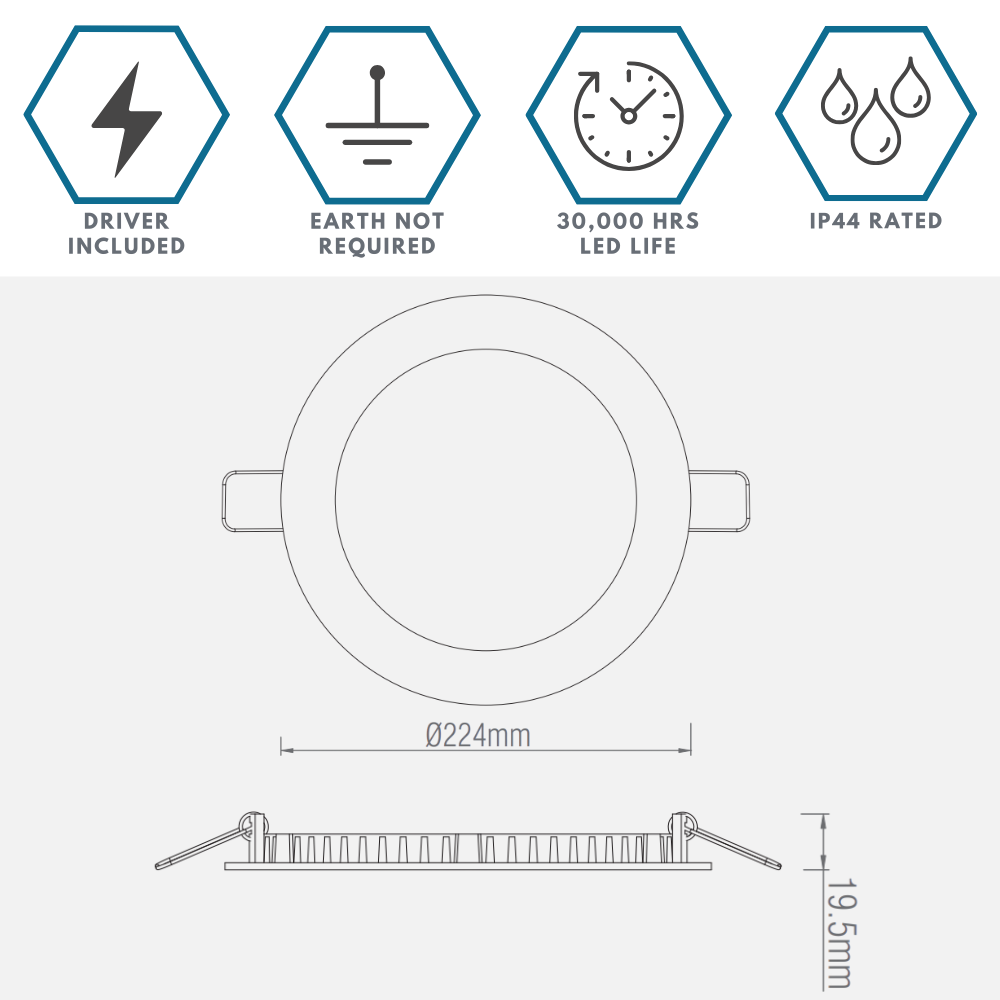 Slim Flat Recessed Round Downlight Panel Light Fitting | LED 18W 1600lm | CCT Tri-Colour | IP44 | White