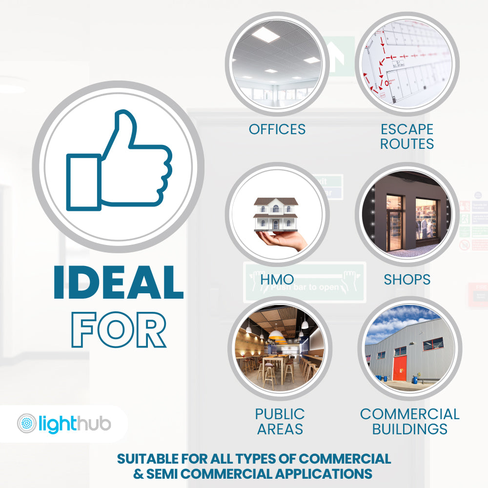 This illuminated LED fire exit sign comes complete with 3 green running man legends; Up, Left & Right directional arrows. The LED box style is typically installed above a doorway but can also be installed on other wall locations.