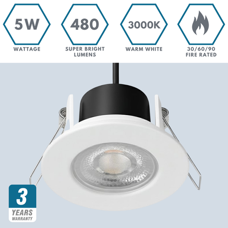Fire Rated Dimmable Downlight Fitting | LED 5W 480lm | 3000K Warm White | IP65 | White