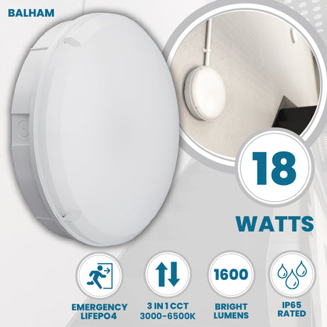 BALHAM Drum Bulkhead Light Fitting | LED 18W 1600lm | CCT Tri-Colour | IP65 | 3hr Emergency Function