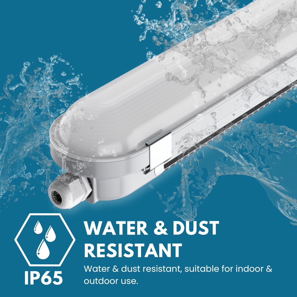 Built with a durable, non-corrosive housing and stainless steel clips, this IP65-rated batten withstands dust, water, and harsh conditions—ideal for garages, workshops, and commercial spaces. Reliable and efficient, it ensures bright illumination with minimal maintenance.