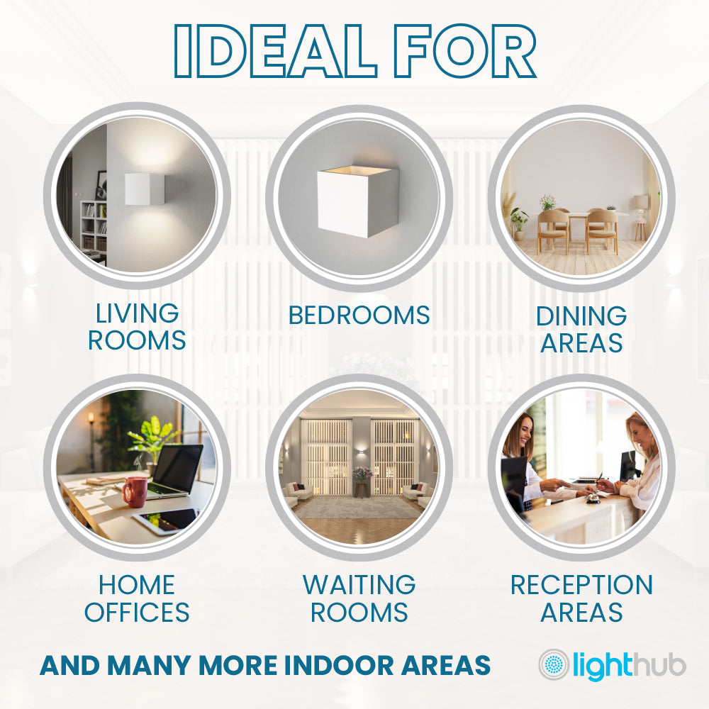 CUBE plaster wall light is a stylish fully paintable uplighter with a smooth white finish and a stunning up down light wall effect.   Perfect for living rooms, stairs, hallways, bedrooms, kitchens, waiting rooms, offices and other indoor areas.